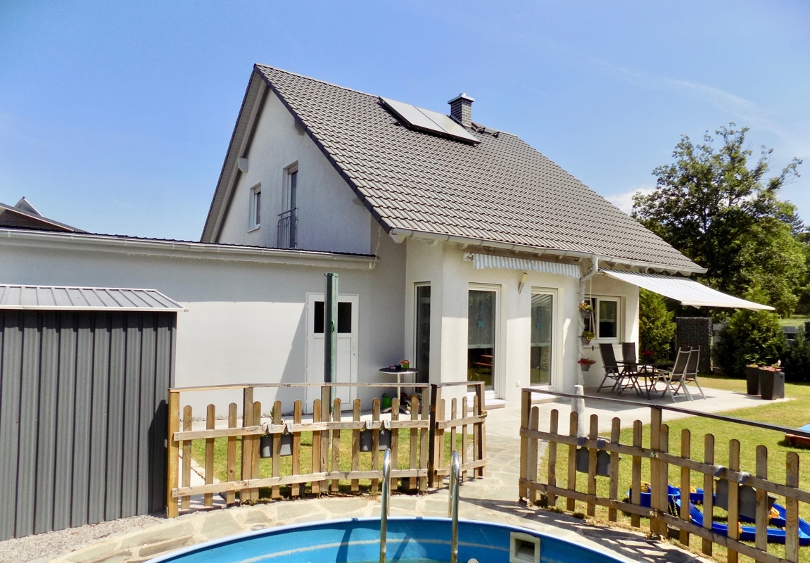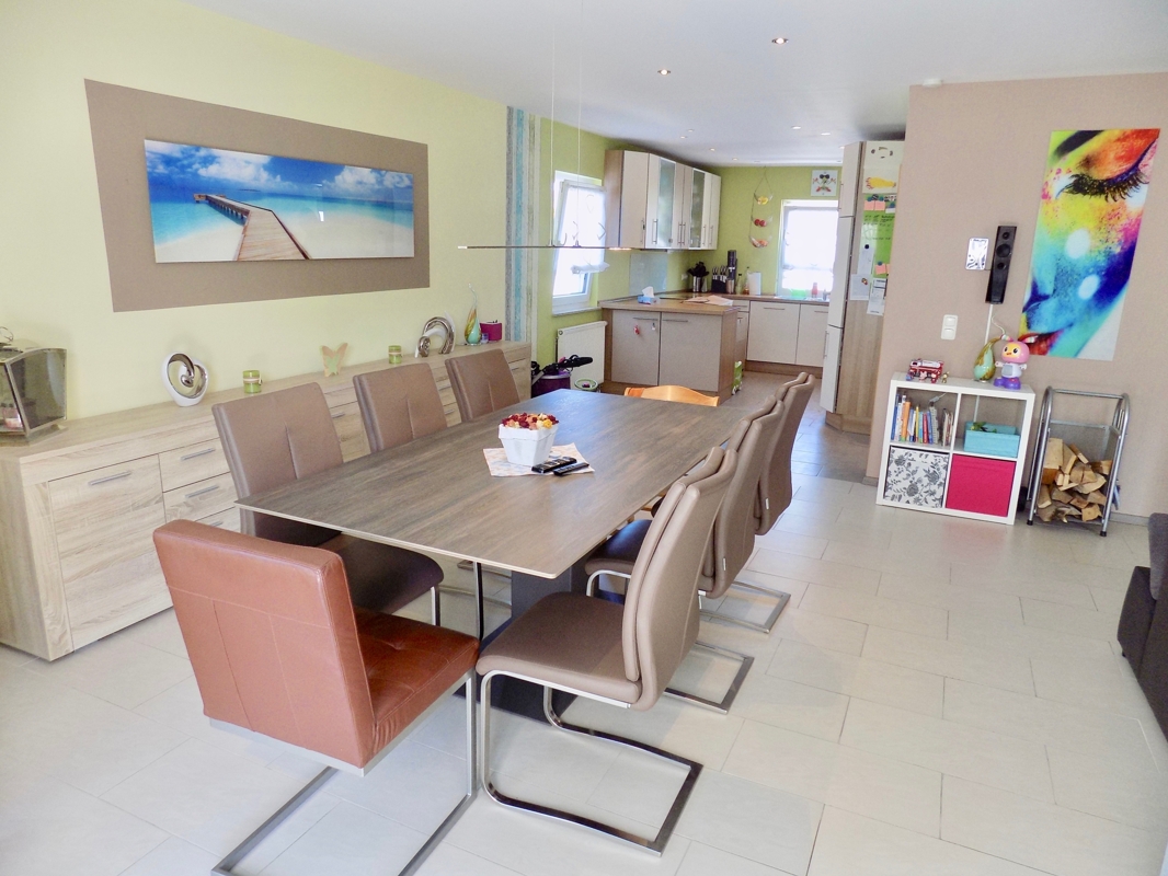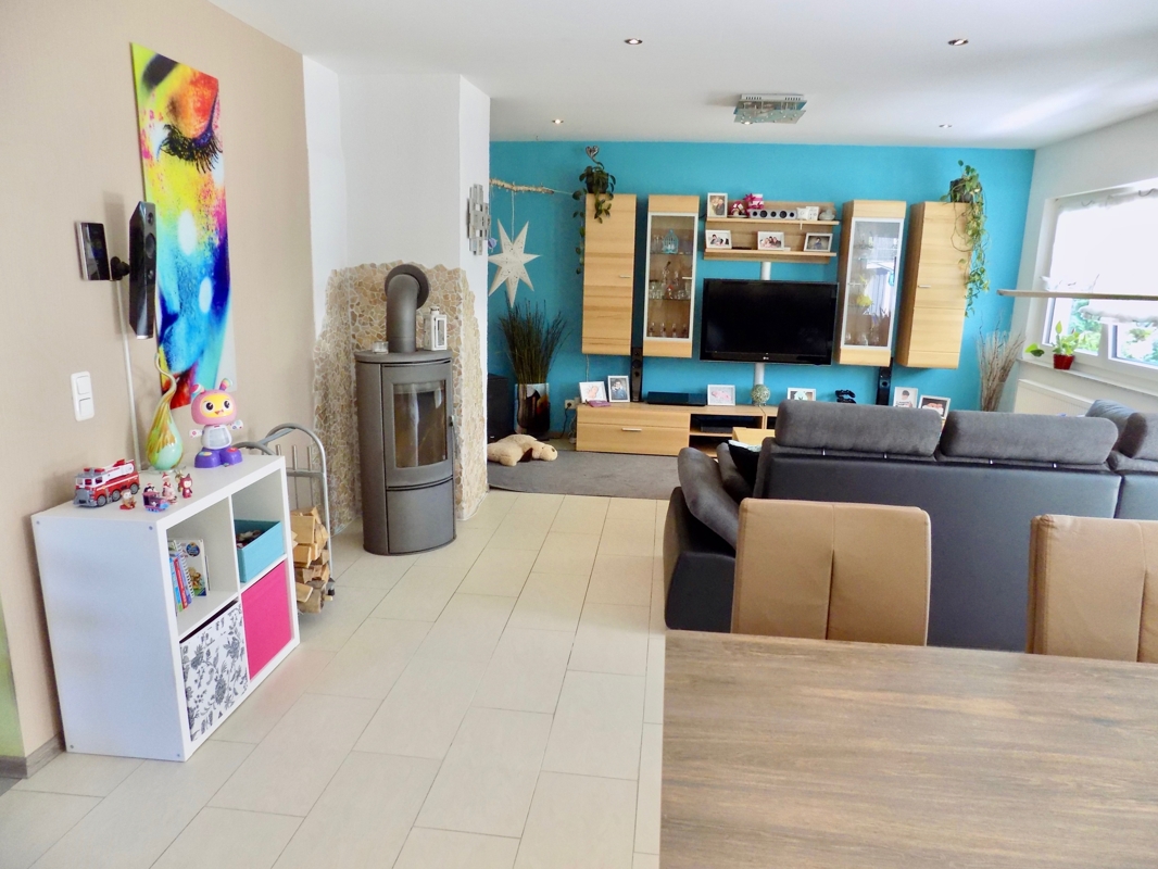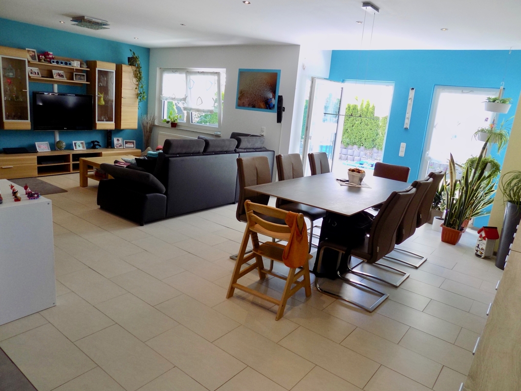 Im Erdgeschoß ist der Haupteingang mit hellem Flur, Gäste-WC und einer offenen Küche mit moderner EBK. Das anschließende großzügig-helle Wohnzimmer mit Essbereich lädt zum gemütlichen Verweilen vor dem Kaminofen ein. Vom Essbereich gelangt man direkt auf die nach Westen ausgerichtete Terrasse mit großem Garten und einem kleinen Swimmingpool, wo man bei heißem Wetter sich wunderbar erfrischen und mit der ganzen Familie Spaß haben kann.