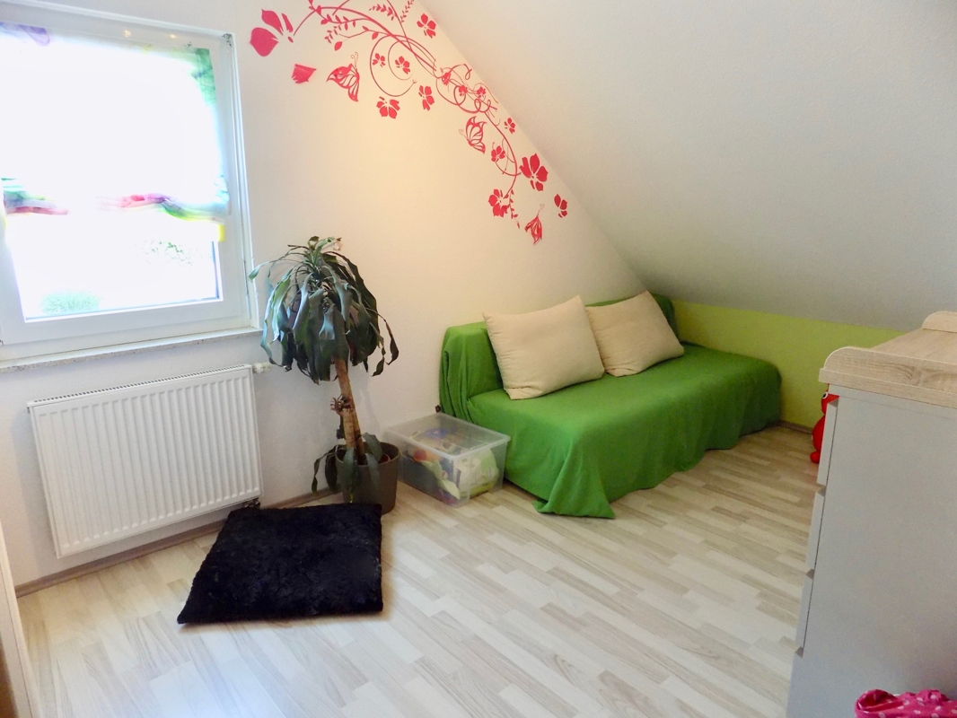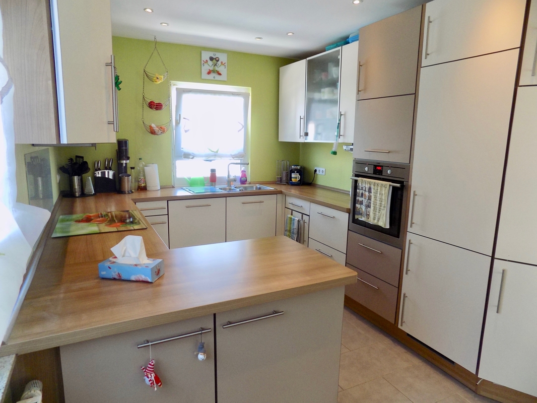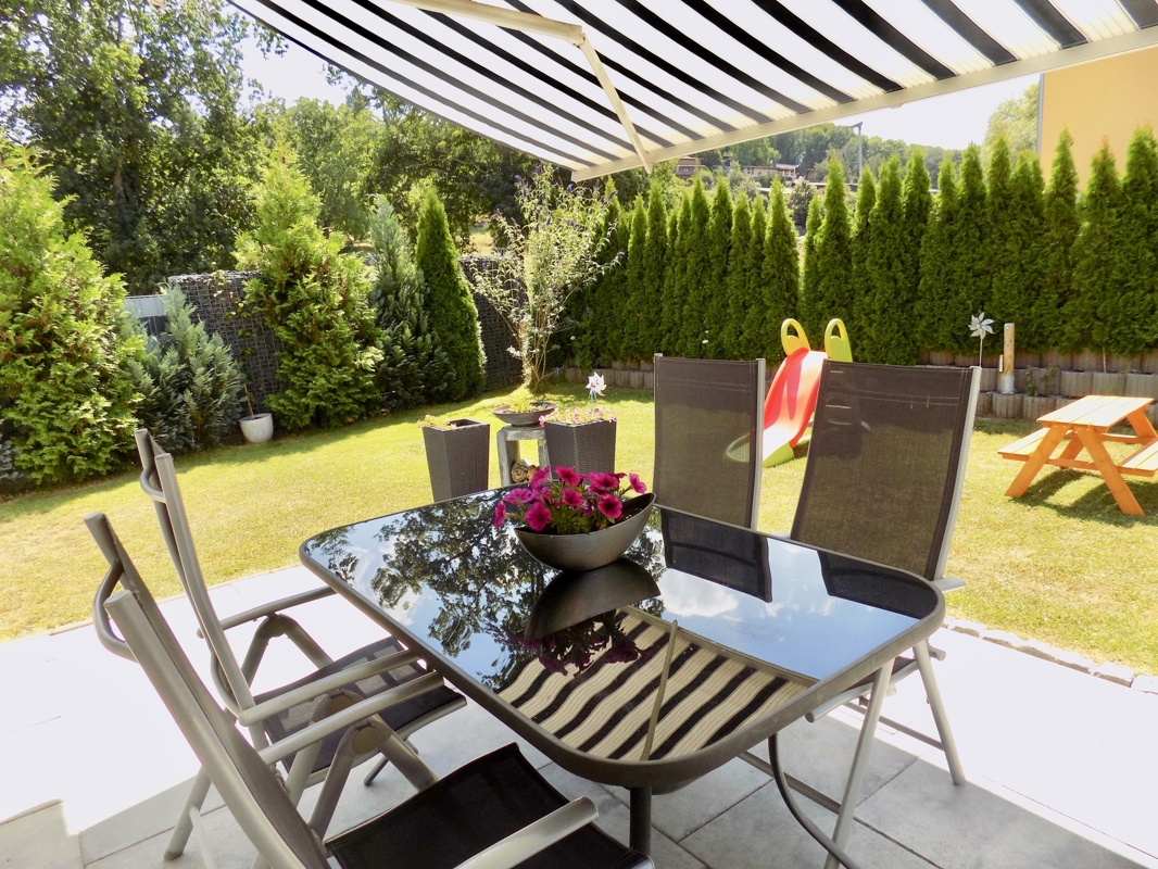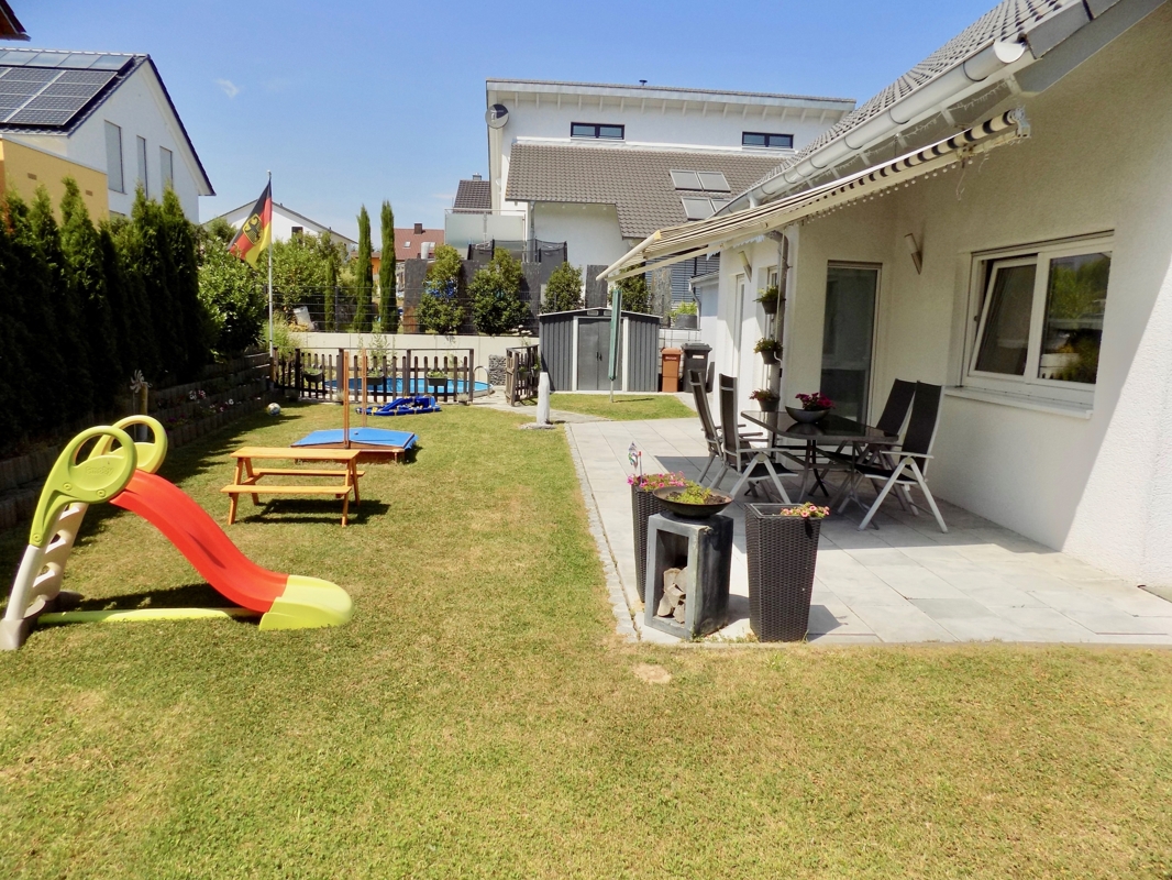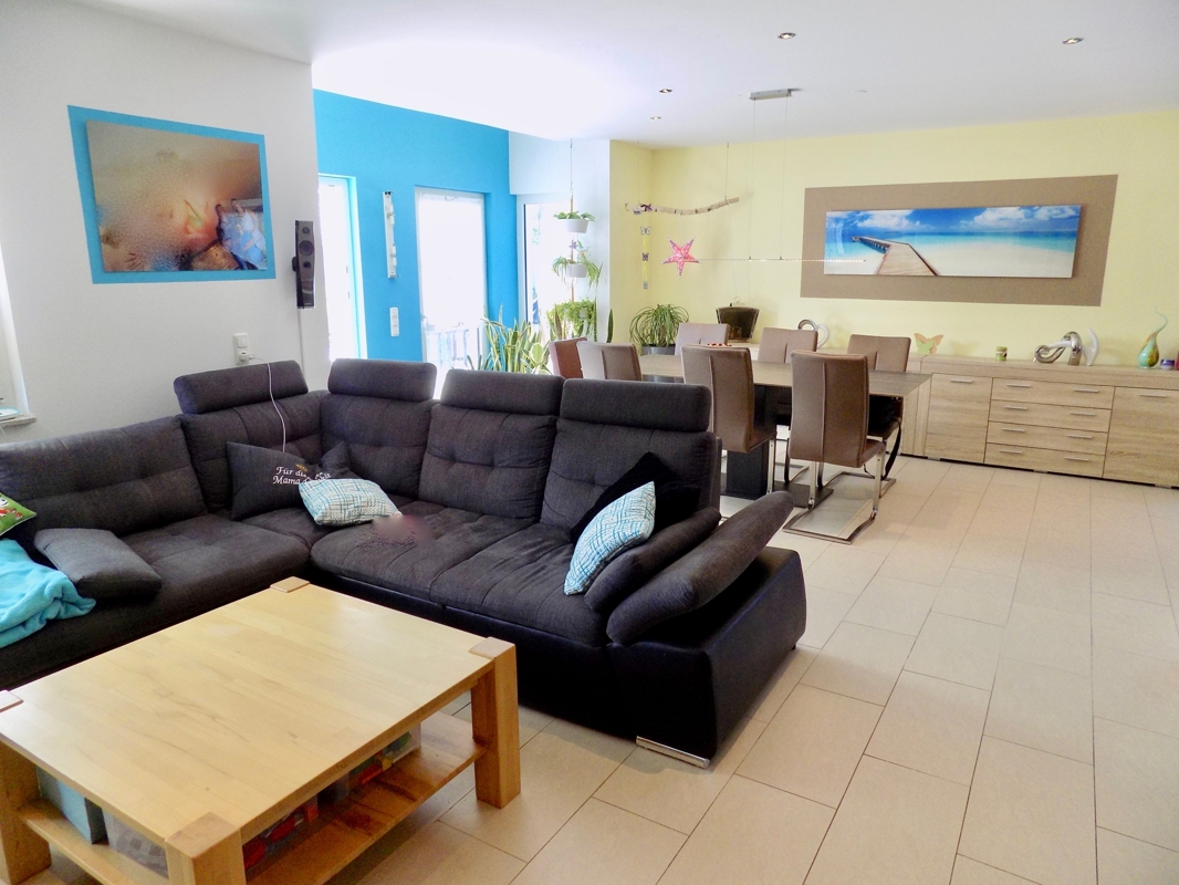 Im Erdgeschoß ist der Haupteingang mit hellem Flur, Gäste-WC und einer offenen Küche mit moderner EBK. Das anschließende großzügig-helle Wohnzimmer mit Essbereich lädt zum gemütlichen Verweilen vor dem Kaminofen ein. Vom Essbereich gelangt man direkt auf die nach Westen ausgerichtete Terrasse mit großem Garten und einem kleinen Swimmingpool, wo man bei heißem Wetter sich wunderbar erfrischen und mit der ganzen Familie Spaß haben kann.