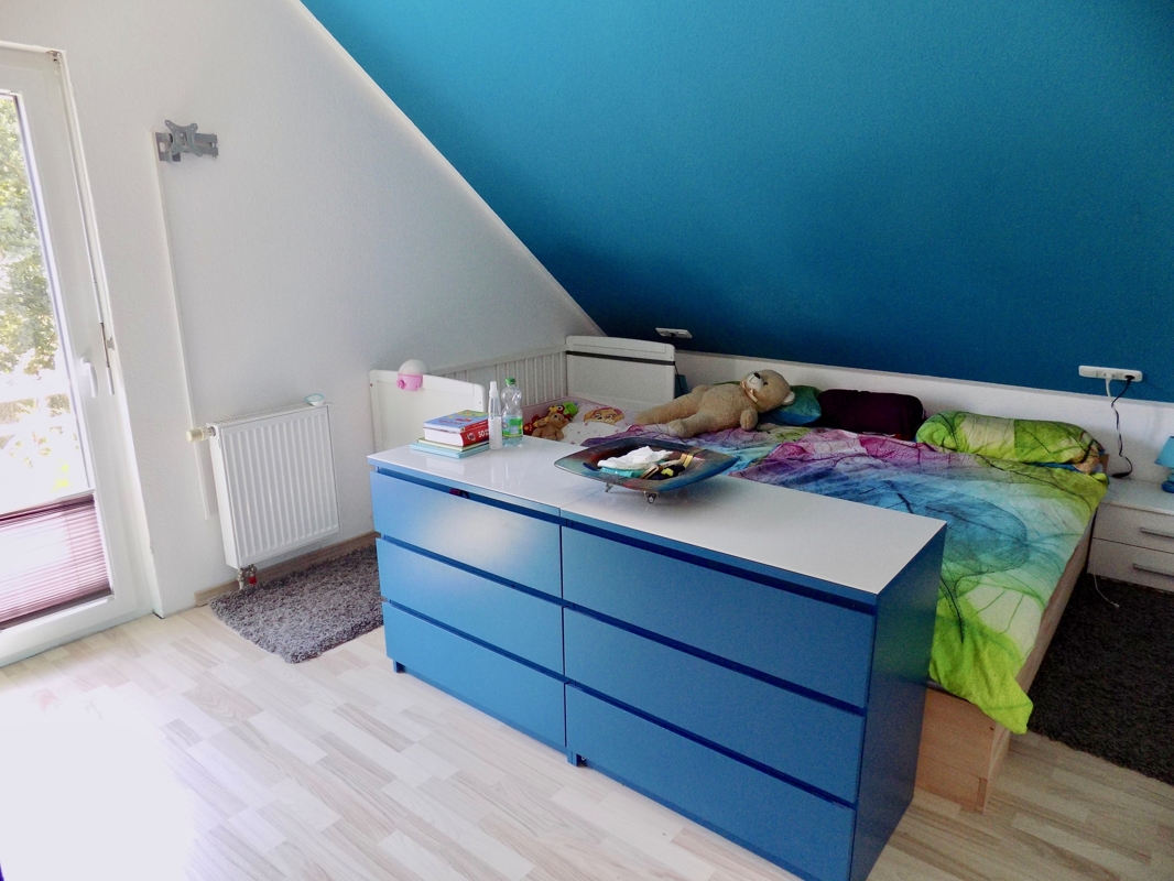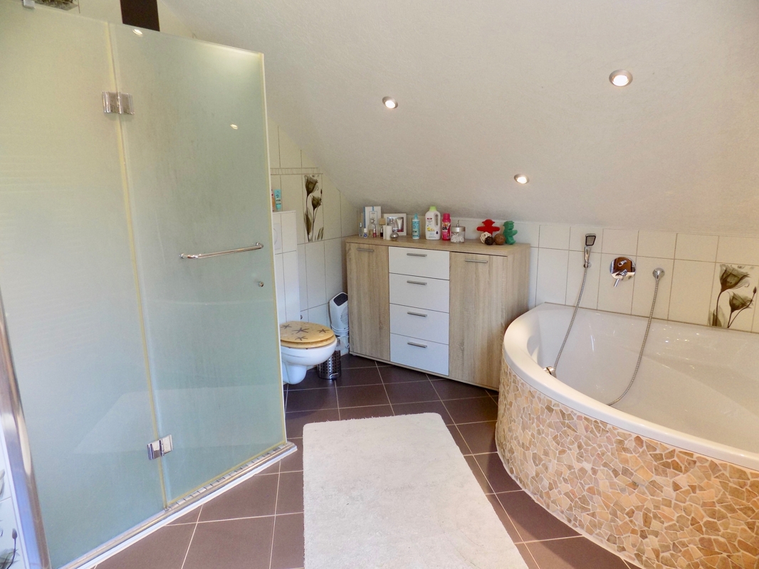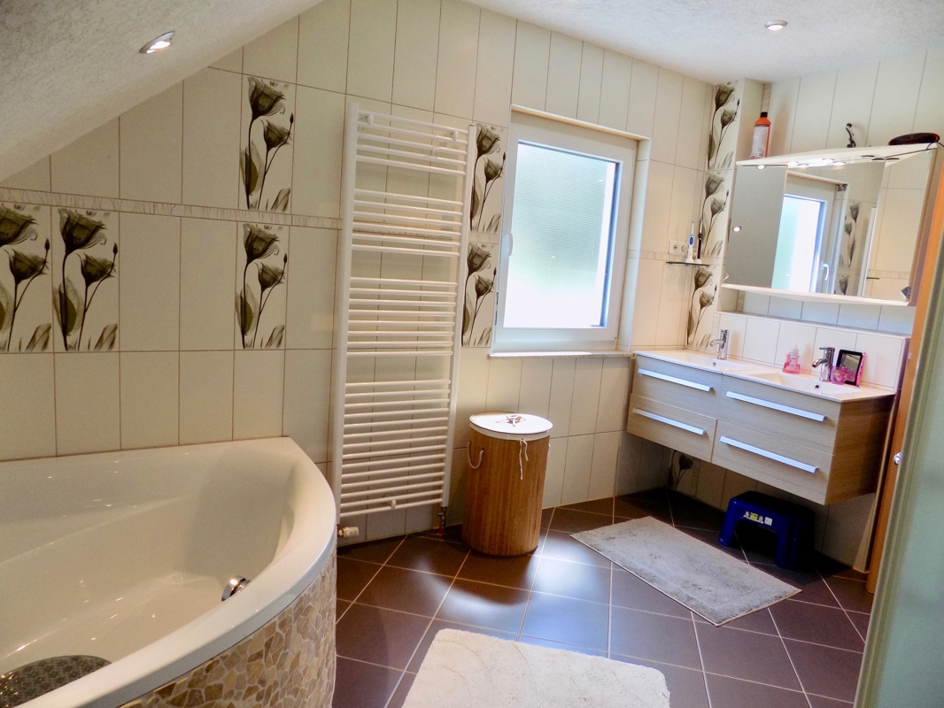 Im Dachgeschoss sind das Elternschlafzimmer, zwei Kinderzimmer, und ein großes Tageslichtbad mit Eckbadewanne, Doppelduschkabine und zwei Waschbecken untergebracht.