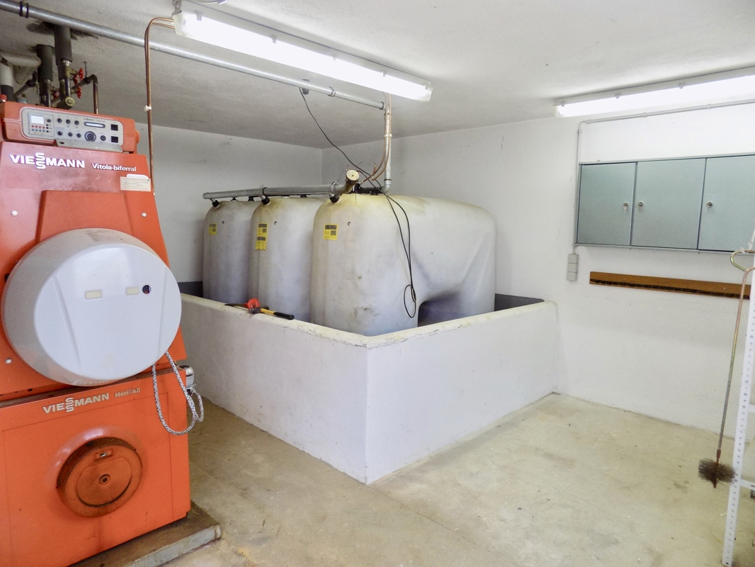 Unter dem Haus befindet sich eine Garage und ein Heizraum.