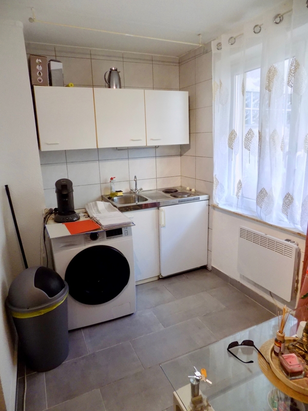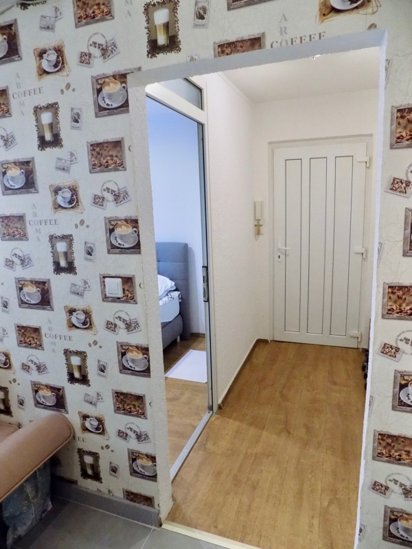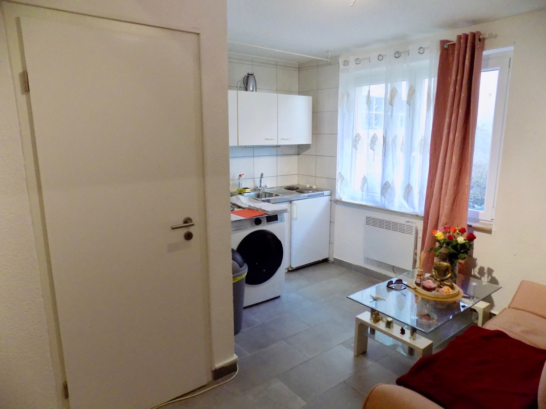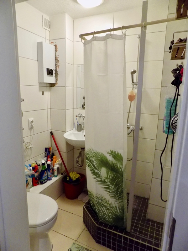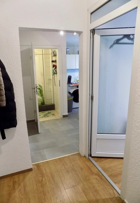 Die rund 21,5 qm Wohnfläche verteilen sich auf den Flur, den Wohnbereich mit Kochnische mit Waschmaschinenanschluss, dem kleinen Schlafzimmer, und dem Badezimmer mit Dusche. Der Wohnbereich ist mit Laminat ausgelegt, das Badezimmer mit Fliesen.